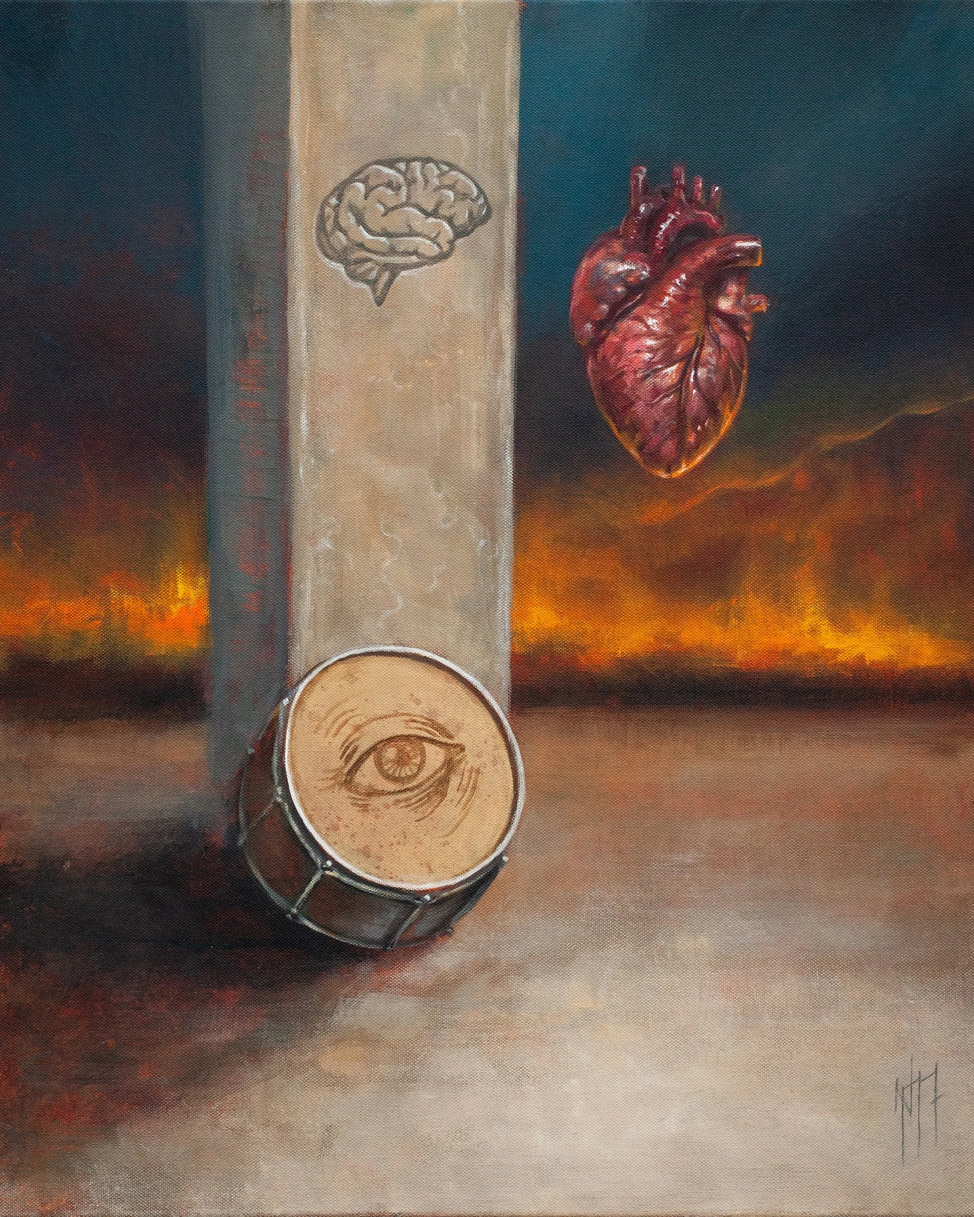 Original painting for Bachir Ramadan memoir book cover, “Obsidian Tempo” that follows his journey as a metal drummer and survivor of 2020 Beirut explosion.